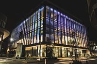 Prachtig buitenaanzicht van het cultureel centrum de Werf bij nacht. Een modern, glazen gebouw dat 's nachts verlicht wordt met kleurrijke lichten, waardoor de architecturale details van het interieur zichtbaar worden. Dit kleurrijk verlichte moderne gebouw ligt in het centrum van Aalst in Oost-Vlaanderen en is de thuisbasis van…