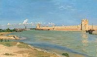 In 1867 bracht Frédéric Bazille een maand door in Aigues-Mortes, een versterkte middeleeuwse stad in Zuid-Frankrijk. Aigues-Mortes, bekend om zijn goed bewaarde vestingmuren en als vertrekpunt voor twee kruistochten, is ook gunstig gelegen op minder dan 20 mijl van wat het familiebezit van Bazille was buiten Montpellier.