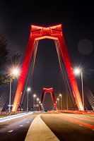 Zicht op de Willemsbrug in Rotterdam in de avond. De lange sluitertijd zorgt voor lichtstrepen van de auto's.