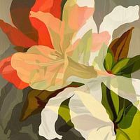 Abstracte weergave van bloemen, met een focus op een grote witte bloem centraal in de compositie. De bloembladen zijn zacht en vloeiend geschilderd, met subtiele tinten van groen, beige en rood die elkaar overlappen en vermengen. Dit creëert een gevoel van diepte en beweging, alsof de bloem in een zacht briesje wiegt.