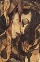 vrouwelijk figuur, nauw verstrengeld, diepe verbondenheid. De lijnen en vormen die om en over de figuren heen lopen, creëren een dynamisch en toch harmonieus geheel, wat kan duiden op de complexiteit en de schoonheid van menselijke relaties. Het kleurenpalet is zacht, met aardse tinten die de sfeer van warmte en geborgenheid versterken.
