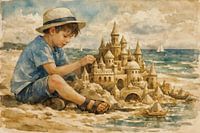 Een aquarel toont een jongen zittend op het strand, gekleed in een blauw shirt, korte broek en een strooien hoed, druk bezig met het bouwen van een groot, gedetailleerd zandkasteel. Het kasteel heeft meerdere torens, bogen en kantelen, en er ligt een klein zandschipje in het ondiepe water ernaast. Op de achtergrond is de zee te zien met…