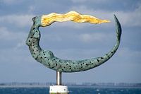 Het beeld is op een hoge paal geplaatst in het water door Stichting Kunstdorp Wemeldinge.