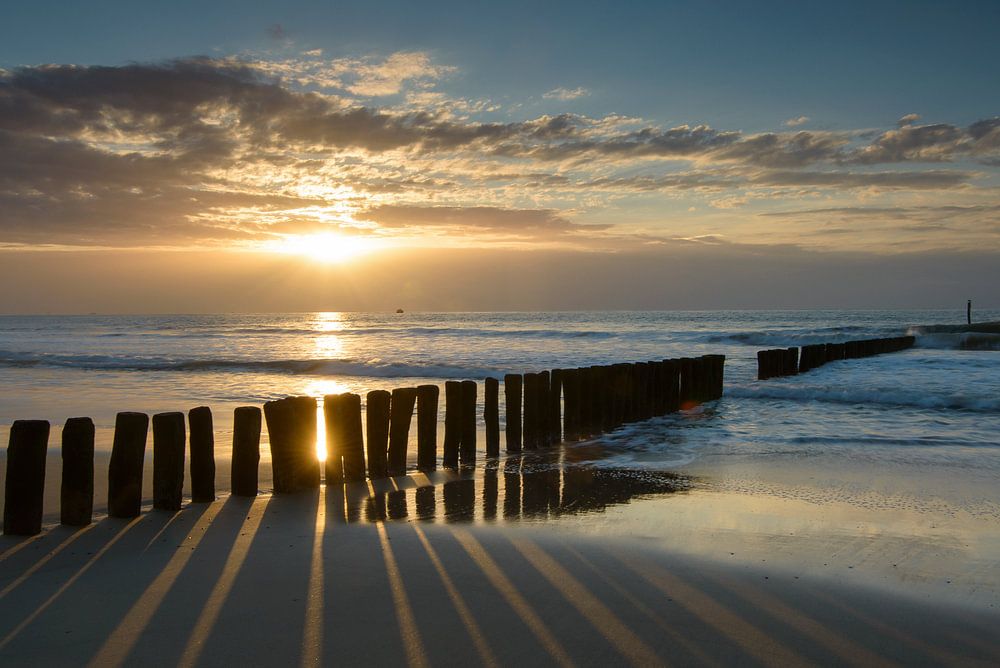 Een zonsondergang aan het Zeeuwse strand bij Cadzand, met de traditionele brandingspaaltjes. Ik heb een tijdje geëxperimenteerd totdat ik tevreden was met deze mix van zon, zee, branding en wolken.