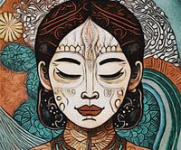 Dit meesterwerk begroet je met een knipoog vanuit het digitale canvas. Daar, in al haar Boeddhistische glorie, zit onze hoofdpersoon, een vrouw die diep mediteert. Ze heeft een gezicht vol sereniteit, en haar gesloten ogen lijken te zeggen: "Geen zorgen, ik heb de antwoorden op alle vragen, maar ik hou het geheimzinnig!"