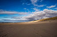 Op het uitgestrekte strand bij Wijk Aan Zee zag ik in de verte twee silhouetten lopen. Door het half bewolkte weer zag ik de zon net op ze schijnen. Ook werd het duin mooi belicht tussen de wolken door. Het was een mooie dag in maart.
