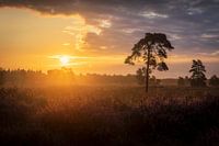 Bij de Roestelberg in de Loonse en Drunense Duinen kleurt de zonsopkomst de bloeiende heide in warme tinten. De zon hangt laag aan de horizon en werpt een zachte, gouden gloed over het landschap. Een eenzame boom staat gebalanceerd in beeld, zijn silhouet subtiel omlijst door de warme stralen. Een moment waarin rust en kleur samensmelten.