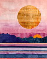 Een grote, gouden cirkel, die de zon voorstelt, domineert de bovenste helft van het schilderij tegen een zachte roze achtergrond, wat de uitgestrektheid van de hemel suggereert. De zon is gedetailleerd met horizontale lijnen, wat een textuur geeft die aan de stralen van de zon doet denken. Onder de zon bevindt zich een reeks gestileerde bergen in verschillende tinten paars en blauw, wat diepte en dimensie aan het landschap toevoegt.