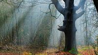 In de mist bleef de woudreus staan, gebroken maar niet verslagen. Gespleten door tijd en storm, hij vangt nog altijd het licht. Wanneer de zon door de mist breekt, vallen de stralen als gouden snaren langs zijn verweerde bast.