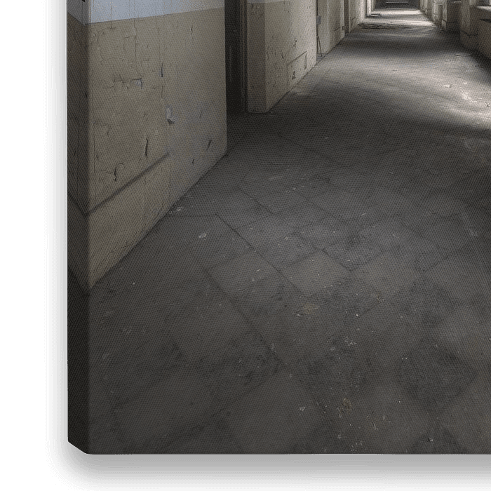 Mooie zwarte gang met een geweldig raam aan de rechterkant wat zorgt voor een mooi licht. Het zwarte aan het plafond is een gevolg van een brand in dit Italiaanse ziekenhuis.