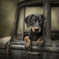 Koop dit portret De Zwarte Teckel en de Oude Truck | Trouwe Co-piloot van Vergeten Wegen van Karina Brouwer op canvas, aluminium dibond, (ingelijste) fotoprint, behang en ArtFrame, op maat geprint in Fine-Art kwaliteit.