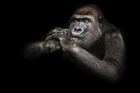 De aandachtige tanden ontbloten gorilla wijfje knaagt iets terwijl het houden van handen bij de snuit terugtrekt, gorilla knaagt, geïsoleerde zwarte achtergrond