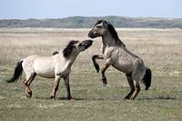 Twee wilde paarden in gevecht met elkaar in natuurgebied De Slufter op het eiland Texel