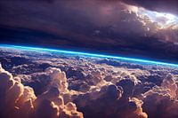 Het adembenemende uitzicht op de wolken zorgen voor een prachtig contrast met de daarboven liggende leegte van het heelal, gescheiden door onze prachtige en kwetsbare ozonlaag. De warmte van de zon reflecteert prachtig terwijl deze de wolken probeert te doorbreken.
