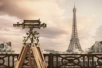 Unieke antieke telescoop op een houten statief op een balkon met uitzicht op de Eiffeltoren van Parijs