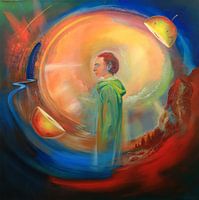 Dit olieverfschilderij presenteert een opvallende synthese tussen traditionele en moderne kunst door het symbolische motief van de appel te verweven met abstracte en wetenschappelijke elementen. Het gebruik van de appel als symbool in de kunst gaat ver terug en wordt vaak geassocieerd met religieuze en mythologische verhalen.