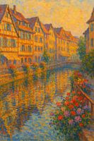 Het warme geel en siena van de gevels smelt samen met het blauw van de gracht. Levendige rode en violette bloemen komen van de balkons en weerspiegelen het ritme van het palet. Het licht lijkt eerder door de straten te stromen dan erop, waardoor de grens tussen architectuur en lucht vervaagt.