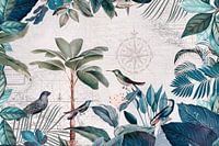 Illustratie met vogels, palmbomen en tropische vegetatie, kompas- en kaartelementen herinneren aan de reizen van de grote ontdekkingsreizigers naar verre landen.