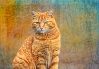 Een rode tabby kat zit voor een abstracte achtergrond.