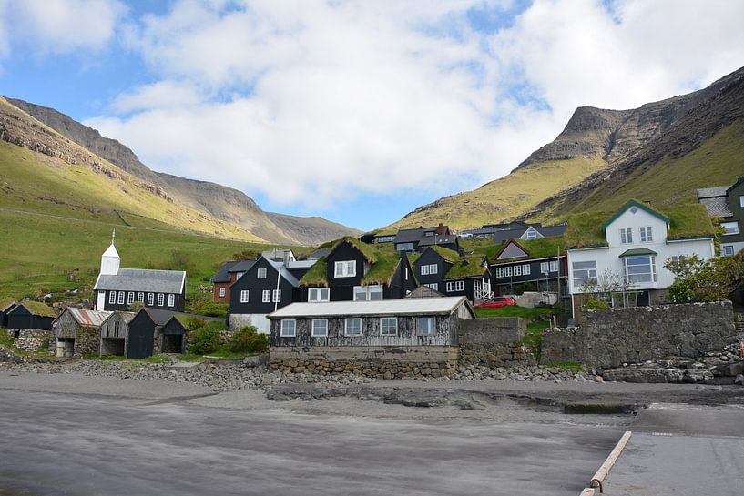 Een weids uitzicht op het historische dorpje Bøur, genesteld aan de voet van de torenhoge hellingen van het Faeröerse gebergte. Deze onbewerkte foto toont de karakteristieke, met zwarte teer bedekte huizen en de met wit afgewerkte kerk die de lokale architectuur kenmerken, met daarbovenop de traditionele, levendig groene graszoden…