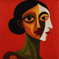 Dit schilderij is een levendige verkenning van dualiteit en identiteit, gemaakt door een kubistisch geïnspireerde lens. Als kunstenaar wilde ik de complexiteit van menselijke emotie en perspectief vastleggen door twee verschillende profielen samen te smelten tot één samenhangend gezicht. De linkerkant, badend in warme oranje en gele tinten, vertegenwoordigt vitaliteit, warmte en uiterlijke expressie. De strakke witte en donkeromlijnde rechterkant symboliseert daarentegen introspectie, mysterie en het rustigere, innerlijke zelf. De verdeling is opzettelijk, een visuele metafoor voor de veelzijdige aard van identiteit.