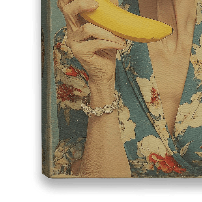 De scène straalt humoristische elegantie en zelfironie uit. Het combineert klassieke schoonheid met een knipoog en een vleugje popcultuur. De felle kleuren en het flirterige spel met de banaan creëren een mix van nostalgie en moderne humor - een symbool van levensvreugde, zelfvertrouwen en de kunst om stijlvol en met humor oud te worden.