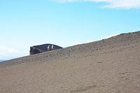 Twee vrouwen beklimmen van een heuvel. Een lava heuvel met een enorme rots achter hen. De volledige helling is bedekt met lava door een eerdere uitbarsting van een vulkaan. De Capelinhos is een vulkaan aan de westkust van het eiland Faial in de Azoren.