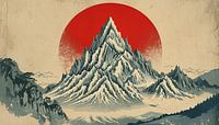 Dit digitale kunstwerk in vintage stijl toont de iconische en majestueuze berg Fuji tegen een grote, opvallende rode zon, die doet denken aan klassieke Japanse houtsneden en reisposters. Het kunstwerk heeft een tijdloos, gedempt kleurenpalet met tinten diepblauw, zacht grijs en helder wit, waardoor een rustige en elegante sfeer ontstaat. De getextureerde achtergrond geeft de indruk van verouderd perkament, wat bijdraagt aan de nostalgische aantrekkingskracht. De afbeelding toont de rauwe schoonheid van de berg, met zijn ruige, besneeuwde toppen en het serene omringende landschap. Dit stuk is perfect om een vleugje klassieke Japanse kunst toe te voegen aan elke ruimte, waarbij traditionele esthetiek wordt gecombineerd met modern digitaal vakmanschap. Het is een ideale keuze voor een woonkamer, slaapkamer of kantoor en geeft een gevoel van rust en kracht.