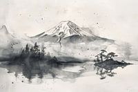 Dit adembenemende landschapschilderij toont de majestueuze berg Fuji in zachte blauwe en beige tinten. Op de voorgrond wiegen rietstengels zachtjes in de wind, terwijl de imposante berg op de achtergrond een kalme en vredige sfeer uitstraalt. De delicate aquarelstreken vangen de essentie van de natuur en nodigen de kijker uit om op te gaan in de rust van dit tafereel. Perfect voor liefhebbers van Japanse landschappen en natuurlijke schoonheid die op zoek zijn naar harmonieuze en rustgevende kunst voor in huis.