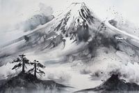 Dit adembenemende landschapschilderij toont de majestueuze berg Fuji in zachte blauwe en beige tinten. Op de voorgrond wiegen rietstengels zachtjes in de wind, terwijl de imposante berg op de achtergrond een kalme en vredige sfeer uitstraalt. De delicate aquarelstreken vangen de essentie van de natuur en nodigen de kijker uit om op te gaan in de rust van dit tafereel. Perfect voor liefhebbers van Japanse landschappen en natuurlijke schoonheid die op zoek zijn naar harmonieuze en rustgevende kunst voor in huis.