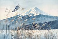 Dit adembenemende landschapschilderij toont de majestueuze berg Fuji in zachte blauwe en beige tinten. Op de voorgrond wiegen rietstengels zachtjes in de wind, terwijl de imposante berg op de achtergrond een kalme en vredige sfeer uitstraalt. De delicate aquarelstreken vangen de essentie van de natuur en nodigen de kijker uit om op te…