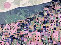 De berg die een stad werd is digitaal gemaakt. Het is een kleurrijk abstract expressionistisch werk dat het verdwijnen van de natuur uitbeeld.