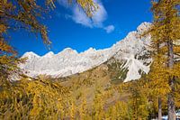 De bergen van Dachstein in het lariksvenster