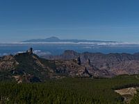 Uitzicht naar het westen over de ruige bergen van Gran Canaria, Canarische Eilanden, Spanje op een zonnige dag in de winter met de beroemde rotsformatie Roque Nublo en het buureiland Tenerife met de vulkaan Pico del Teide aan de horizon.