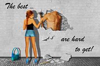Straat-Art in Digital-Art mit Pin-up girl und einem Mann hinter der Mauer mit Sixpack. Mit englischem Tekst: De beste zijn moeilijk te krijgen!