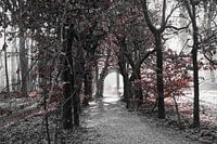 In de mooie bossen van Baarn in Nederland zijn deze tunnels van beuken te zien en hier ontwaakt het bos tijdens een koude winternacht in zwart wit met bruin accenten. Waar de zonnestralen de poort van het bos verlichten