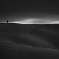 Na een lange balts heb ik een foto gemaakt die ik al lang in gedachten had. Ik had die eenzame cipres die een heuvel in het landschap van de Kreta Senesi beklimt al vele jaren geobserveerd, maar hij liet niet zien hoe ik hem wilde hebben. Ik zocht naar een intens en dramatisch zwart-wit in de contrasten van de lucht, en een lichte textuur met weinig storende elementen op de glooiende heuvels. Of liever gezegd: Ik streefde naar laaghangende wolken en een lichte ploert die de maanachtige essentie van het Kreta, de bewerkte klei, liet zien. En uiteindelijk, in een van de laatste dagen van november 2020, stonden alle sterren op één lijn, en transformeerde ik wat ik me tot dan toe alleen maar had voorgesteld in een foto.