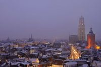 De binnenstad van Utrecht gezien vanaf het dakterras van La Place (V&D) tijdens een mistige avond van Valentijnsdag. De verlichte winkelstraat is de Steenweg, aan de rechterkant zie je de Buurkerk en daarachter de Domkerk en Domtoren.