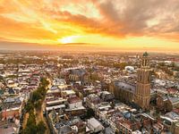 De binnenstad van Zwolle tijdens een koude winterochtend van bovenaf gezien met de Peperbuskerktoren, een van de hoogste en beroemdste kerktorens van Nederland. De daken zijn bedekt met een dun laagje sneeuw.