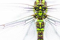 door de libel van boven te benaderen is de motor van de libel goed zichtbaar. De witte achtergrond versterkt de fel groene kleuren van deze libel.