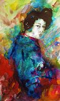 Aquarel / Kleur / Geisha / Japan / Portret / Blauw / Vrouw / Traditie / Kijken / Zitten / Zwart haar / Blank gezicht / Geschminkt / Schilderkunst / Figuratief / Abstracte kunst