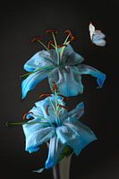 Waanzinnig dat je deze grote bloemen, de lelie, nu ook in zeer mooie kleuren, zoals deze helder blauwe kleur kunt kopen, een mooi contrast met alle andere in een boeket met pauwenveren.