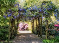 Pergola met blauwe regen en roze rhododendron in groen park