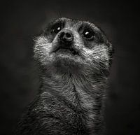 Stokstaartjes zijn immens fotogeniek. Met een beetje moeite kan je prachtige foto's nemen van hun doen en laten. Deze mimiek vond ik persoonlijk de meest ontwapenende. De onschuld (of ondeugendheid) kan je uit zijn ogen scheppen. Dit werd mooi vertaald in het zwart-wit op een donkere achtergrond.