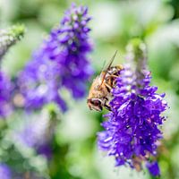 Een prachtige bij op paarse bloemen. Gemaakt in de tuin. Voor de echte natuurliefhebber.