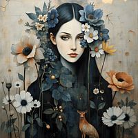 Dit betoverende portret toont een jonge vrouw met een kalme, bijna etherische uitstraling. Haar porseleinachtige huid en donkere, rechte haren vormen een krachtig contrast met de overvloed aan bloemen en planten die haar omringen — of zelfs uit haar lijken te groeien. De bloemen zijn rijk in kleur: zachte crèmetinten, diepblauw,…