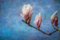 De bloemknoppen van de magnolia staan op springen. De lente kondigt zich aan. Deze boom bloeit vroeg in het voorjaar. De prachtige grote bloemen zijn vaak wit of roze. Als een twijg breekt ruik je een sterke geur die aan anijs doet denken. Deze foto is voorzien van een andere achtergrond met een texture.