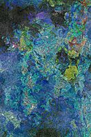 Een digitaal abstract kunstwerk, vol beweging en voorgestelde textuur in een prachtige reeks blauwtinten. Azuurblauw, elektrisch blauw en aquamarijn zijn allemaal prominent aanwezig, met enkele gele, rode en paarse accenten.