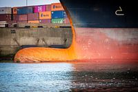 Een containerschip ligt zwaar afgemeerd aan de kade op de Maasvlakte. De bulb van de boeg, zwart geverfd en getekend door roest, steekt net boven het water uit. Op de kade staan containers strak gestapeld. De bolders houden de lijnen onder spanning, het beton langs de kade is ruw en versleten. De haven ademt rauwheid en kracht.