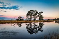 De wolken achter deze prachtige bomen vangen het eerste zonlicht van de opkomende zon. Kraloo is samen met Holtveen deel van het Nationaal Park het Dwingelderveld. In dit deel zijn een aantal vennen. Het is er dan ook behoorlijk drassig om te lopen.